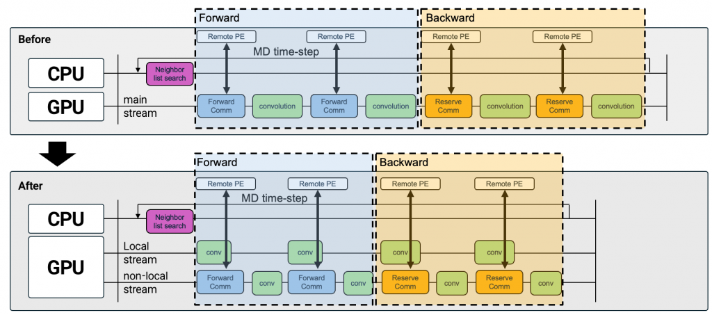 LAMMPS와 GROMACS와 같은 heterogeneous 하드웨어 기반 MD 시뮬레이터에서 GNN-IP를 효율적으로 가속하기 위해, GPU 상의 local 계산과 non-local 통신을 분리하고 이를 overlap하는 pipelining 기법을 연구하고 있습니다. GNN의 forward 및 backward 단계에서 halo atom exchange 통신이 발생되는 convolution 연산을 non-local GPU 스트림으로 분리하고, 이를 local convolution 연산과 동시에 수행함으로써 통신 지연을 은닉한다. 이를 통해 기존의 직렬 실행 구조 대비 GPU 자원 활용도를 향상시키고, GNN-IP 기반 MD 시뮬레이션의 시간당 처리 성능을 개선하고자 합니다.